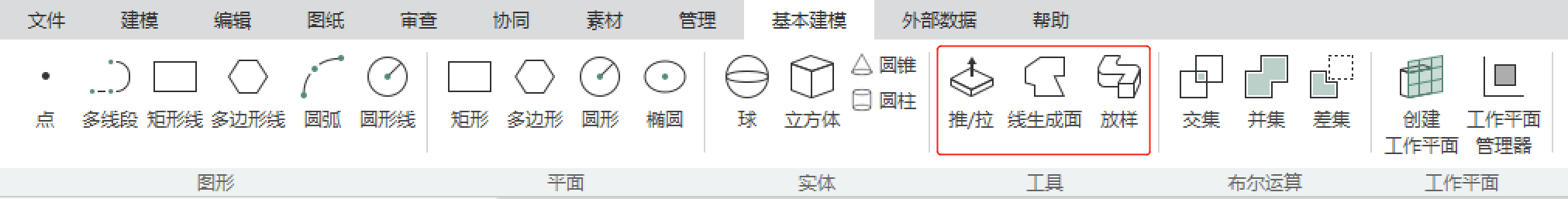 基本建模模块提供的工具有推/拉、线生成面、放样。
