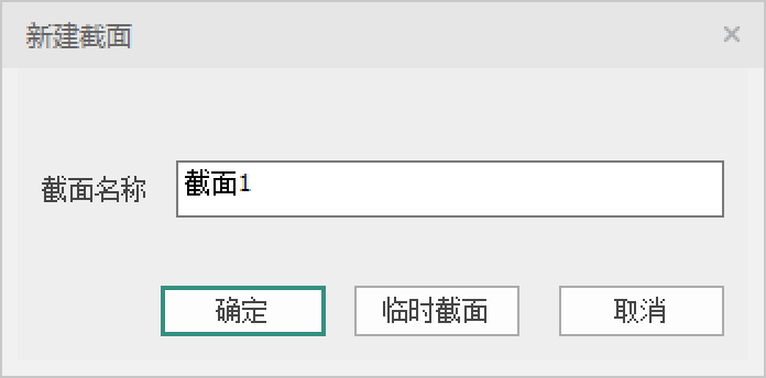 - 与绘制截面类似,点击绘制截面按钮后,将弹出新建截面对话框。可定义截面名称,点击“确定”后进入截面拾取流程,或选择点击“临时截面”。若选择“临时截面”,将在截面被拾取完成后以该名称命名。