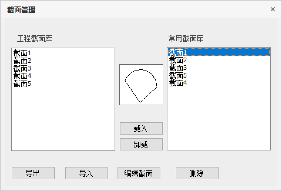 - 工程截面库:展示在本工程内存储的由放样功能生成的截面。点击截面条目,可在右侧看到预览。选中某一截面后,可点击“载入”将其迁移至常用截面库。