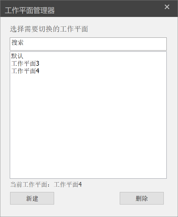 - 点击“工作平面管理器”,弹出相应对话框,如图所示。用户可在其中切换、新建、删除工作平面。