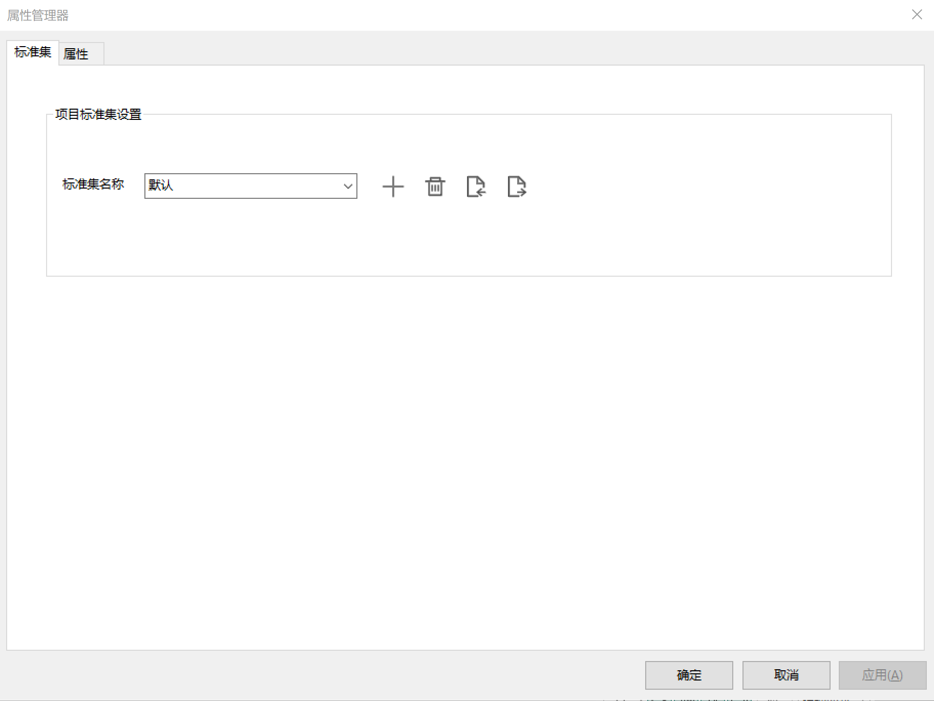 在“标准集”页签内,允许选择当前项目所应用标准集。项目标准集包含了一种配置下所有构件和属性的信息,与属性模板相似。