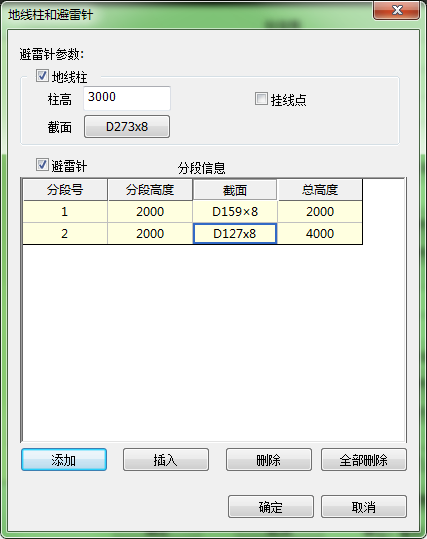 避雷针信息包括分段高度、截面和总高度信息,即可定义不同的分段数和分段高度,同时设置每段对应的截面信息。