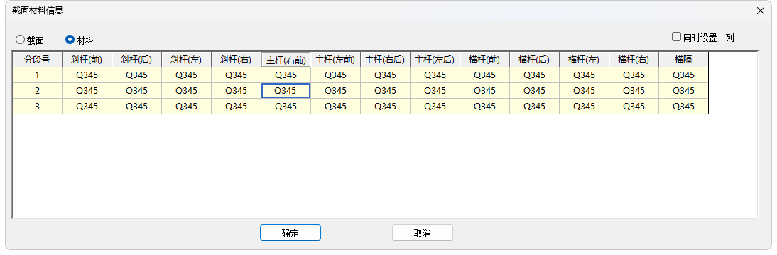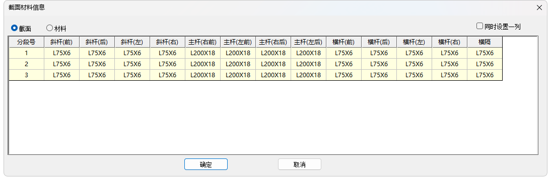1)截面信息:分段定义构架柱各类杆件截面信息和材料信息,包括主杆、斜杆和横杆等等,如下图所示: