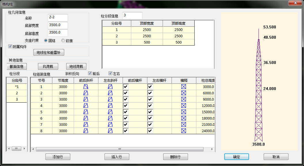 (5)柱组装信息:每个格构柱由若干柱段组成,每个柱段由若干柱节组成,通过设置柱节间杆件布置形式,完成格构柱定义。