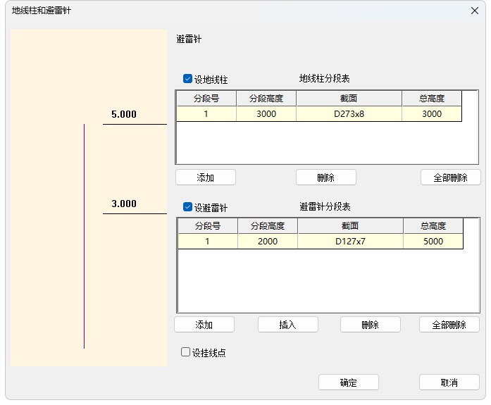 避雷针信息包括分段高度、截面和总高度信息,即可定义不同的分段数和分段高度,同时设置每段对应的截面信息。