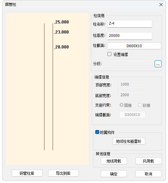 圆管柱定义信息包括柱信息(柱名称、柱高度、柱截面)、分段信息、是否带端撑信息、是否设置附属构件、地线荷载、风荷载、截面信息、模型预览等参数。
