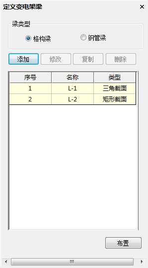 目录 搜索 展开 首页版权与商标说明免责声明第1章 软件功能简介1.1 软件概述1.2 技术依据第2章 参数化建模2.1 创建模型2.1.1 正交轴网2.1.2 构架柱1、人字柱建模2、格构柱建模3、圆管柱建模2.1.3 构架梁1、格构梁建模2、圆管梁建模2.1.4 独立避雷针1、钢管避雷针2、三角形格构避雷针3、四边形格构避雷针2.1.5 构架编辑2.1.6 避雷针编辑2.2 构件编辑2.2.1 截面定义2.2.2 构件删除和构件复制2.3 构件信息2.3.1 材料定义2.3.2 计算长度系数2.4 荷载布置2.4.1 风荷载2.4.2 点线荷载2.4.3 温度作用第3章 约束布置3.1 支座约束3.2 梁单元端部约束3.2.1 一端铰接/两端铰接/两端刚接/删除一端铰接3.2.2 梁端约束第4章 计算分析与结果查看4.1 模型检查4.2 设计参数4.2.1 设计信息4.2.2 地震计算信息4.2.3 工况组合4.3 线性计算4.3.1 线性计算4.3.2 模态分析4.4 计算结果查询4.4.1 位移显示4.4.2 内力显示4.4.3 支座反力显示4.4.4 振型结果显示4.4.5 内力表格4.4.6 构件验算查询4.4.7 生成计算书4.5 基础设计第5章 节点设计5.1 连接设计5.1.1 连接参数1、通用参数2、人字柱参数3、桁架梁参数4、全圆管格构梁参数5、钢管柱参数6、钢管梁参数7、格构柱参数(主杆角钢)8、地线柱与避雷针参数5.1.2 自动设计5.1.3 补充连接设计1、法兰节点2、角钢分段节点3、挂线点节点4、检修走道5、爬梯5.1.4 基础设计1.使用变电构架的基础设计2.使用跳转PM基础进行基础设计5.2 节点编辑第6章 施工图设计6.1 图纸配置6.2 施工图生成第7章 接力REVIT或ABD技术条件一 抗震设计基本规定1.1 重力荷载代表值1.2 抗震设计调整二 荷载2.1 荷载工况2.2 风荷载2.2.1 风荷载体型系数2.2.2 风压高度变化系数2.2.3 风振系数2.3 荷载效应组合2.3.1 运行工况1、大风工况2、覆冰有风工况3、温度有风工况2.3.2 安装工况2.3.3 检修工况2.3.4 地震作用工况2.3.5 正常使用工况三 连接计算3.1 螺栓连接3.2 焊缝连接3.3 法兰节点3.4 柱脚节点四 基础设计4.1 地基验算4.1.1 基底压力计算4.1.2 修正后的地基承载力特征值计算4.1.3 地基抗震承载力调整4.1.4 基础底面积确定4.2 基础抗拔和抗倾覆稳定验算4.2.1 基础抗拔稳定验算4.2.2 基础抗倾覆稳定验算4.3 基础计算4.3.1 基础高度取值4.3.2 基础冲切验算4.3.3 基础受剪承载力计算4.3.4 基础底板受弯配筋计算 暂无相关搜索结果! 2.1.3 构架梁 2.1.3 构架梁 构架梁定义和布置菜单如下图所示。 图2-30 构架梁定义和布置对话框 构架梁类型包括格构梁和钢管梁。可通过“添加”、“修改”、“复制”和“删除”命令管理已定义构架梁,并通过布置命令完成构架梁布置。 连续布置功能目前只支持构架梁的人字柱柱顶连接。其他选项都为灰显,不可更改。当建立一根轴线上跨度相等、高度相同的连续多跨构架梁模型时,连续布置功能支持用户通过点击起点和终点,自动在各个柱顶节点间布置构架梁,减少重复性操作。