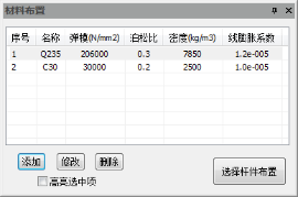 目录 搜索 展开 首页版权与商标说明免责声明第1章 软件功能简介1.1 软件概述1.2 技术依据第2章 参数化建模2.1 创建模型2.1.1 正交轴网2.1.2 构架柱1、人字柱建模2、格构柱建模3、圆管柱建模2.1.3 构架梁1、格构梁建模2、圆管梁建模2.1.4 独立避雷针1、钢管避雷针2、三角形格构避雷针3、四边形格构避雷针2.1.5 构架编辑2.1.6 避雷针编辑2.2 构件编辑2.2.1 截面定义2.2.2 构件删除和构件复制2.3 构件信息2.3.1 材料定义2.3.2 计算长度系数2.4 荷载布置2.4.1 风荷载2.4.2 点线荷载2.4.3 温度作用第3章 约束布置3.1 支座约束3.2 梁单元端部约束3.2.1 一端铰接/两端铰接/两端刚接/删除一端铰接3.2.2 梁端约束第4章 计算分析与结果查看4.1 模型检查4.2 设计参数4.2.1 设计信息4.2.2 地震计算信息4.2.3 工况组合4.3 线性计算4.3.1 线性计算4.3.2 模态分析4.4 计算结果查询4.4.1 位移显示4.4.2 内力显示4.4.3 支座反力显示4.4.4 振型结果显示4.4.5 内力表格4.4.6 构件验算查询4.4.7 生成计算书4.5 基础设计第5章 节点设计5.1 连接设计5.1.1 连接参数1、通用参数2、人字柱参数3、桁架梁参数4、全圆管格构梁参数5、钢管柱参数6、钢管梁参数7、格构柱参数(主杆角钢)8、地线柱与避雷针参数5.1.2 自动设计5.1.3 补充连接设计1、法兰节点2、角钢分段节点3、挂线点节点4、检修走道5、爬梯5.1.4 基础设计1.使用变电构架的基础设计2.使用跳转PM基础进行基础设计5.2 节点编辑第6章 施工图设计6.1 图纸配置6.2 施工图生成第7章 接力REVIT或ABD技术条件一 抗震设计基本规定1.1 重力荷载代表值1.2 抗震设计调整二 荷载2.1 荷载工况2.2 风荷载2.2.1 风荷载体型系数2.2.2 风压高度变化系数2.2.3 风振系数2.3 荷载效应组合2.3.1 运行工况1、大风工况2、覆冰有风工况3、温度有风工况2.3.2 安装工况2.3.3 检修工况2.3.4 地震作用工况2.3.5 正常使用工况三 连接计算3.1 螺栓连接3.2 焊缝连接3.3 法兰节点3.4 柱脚节点四 基础设计4.1 地基验算4.1.1 基底压力计算4.1.2 修正后的地基承载力特征值计算4.1.3 地基抗震承载力调整4.1.4 基础底面积确定4.2 基础抗拔和抗倾覆稳定验算4.2.1 基础抗拔稳定验算4.2.2 基础抗倾覆稳定验算4.3 基础计算4.3.1 基础高度取值4.3.2 基础冲切验算4.3.3 基础受剪承载力计算4.3.4 基础底板受弯配筋计算 暂无相关搜索结果! 2.3.1 材料定义 2.3.1 材料定义 材料定义对话框如图所示,列表中前两项材料为程序默认的材料,可以进行修改,但无法删除。添加或修改列表中的材料有三种途径:左键双击列表、右键单击列表和对话框下方的按钮。目前程序不支持自定义材料,如果有特殊需要,可以与研发人员联系解决。 图2-60 材料定义对话框