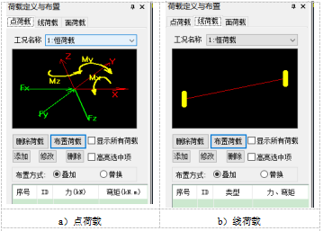 点荷载、线荷载都集成在一个左侧停靠对话框,实际上点击个按钮都进入该对话框,在对话框内同样可以切换点、线荷载,如图2-64所示。