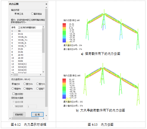 目录 搜索 展开 首页版权与商标说明免责声明第1章 软件功能简介1.1 软件概述1.2 技术依据第2章 参数化建模2.1 创建模型2.1.1 正交轴网2.1.2 构架柱1、人字柱建模2、格构柱建模3、圆管柱建模2.1.3 构架梁1、格构梁建模2、圆管梁建模2.1.4 独立避雷针1、钢管避雷针2、三角形格构避雷针3、四边形格构避雷针2.1.5 构架编辑2.1.6 避雷针编辑2.2 构件编辑2.2.1 截面定义2.2.2 构件删除和构件复制2.3 构件信息2.3.1 材料定义2.3.2 计算长度系数2.4 荷载布置2.4.1 风荷载2.4.2 点线荷载2.4.3 温度作用第3章 约束布置3.1 支座约束3.2 梁单元端部约束3.2.1 一端铰接/两端铰接/两端刚接/删除一端铰接3.2.2 梁端约束第4章 计算分析与结果查看4.1 模型检查4.2 设计参数4.2.1 设计信息4.2.2 地震计算信息4.2.3 工况组合4.3 线性计算4.3.1 线性计算4.3.2 模态分析4.4 计算结果查询4.4.1 位移显示4.4.2 内力显示4.4.3 支座反力显示4.4.4 振型结果显示4.4.5 内力表格4.4.6 构件验算查询4.4.7 生成计算书4.5 基础设计第5章 节点设计5.1 连接设计5.1.1 连接参数1、通用参数2、人字柱参数3、桁架梁参数4、全圆管格构梁参数5、钢管柱参数6、钢管梁参数7、格构柱参数(主杆角钢)8、地线柱与避雷针参数5.1.2 自动设计5.1.3 补充连接设计1、法兰节点2、角钢分段节点3、挂线点节点4、检修走道5、爬梯5.1.4 基础设计1.使用变电构架的基础设计2.使用跳转PM基础进行基础设计5.2 节点编辑第6章 施工图设计6.1 图纸配置6.2 施工图生成第7章 接力REVIT或ABD技术条件一 抗震设计基本规定1.1 重力荷载代表值1.2 抗震设计调整二 荷载2.1 荷载工况2.2 风荷载2.2.1 风荷载体型系数2.2.2 风压高度变化系数2.2.3 风振系数2.3 荷载效应组合2.3.1 运行工况1、大风工况2、覆冰有风工况3、温度有风工况2.3.2 安装工况2.3.3 检修工况2.3.4 地震作用工况2.3.5 正常使用工况三 连接计算3.1 螺栓连接3.2 焊缝连接3.3 法兰节点3.4 柱脚节点四 基础设计4.1 地基验算4.1.1 基底压力计算4.1.2 修正后的地基承载力特征值计算4.1.3 地基抗震承载力调整4.1.4 基础底面积确定4.2 基础抗拔和抗倾覆稳定验算4.2.1 基础抗拔稳定验算4.2.2 基础抗倾覆稳定验算4.3 基础计算4.3.1 基础高度取值4.3.2 基础冲切验算4.3.3 基础受剪承载力计算4.3.4 基础底板受弯配筋计算 暂无相关搜索结果! 4.4.2 内力显示 4.4.2 内力显示 用于显示内力云图或内力标注。 如图4-12所示,内力云图包含两方面输出内容,“工况”与“基本组合”。“工况”主要针对单工况荷载而言,选择“工况”列表中的单工况荷载,以及内力选项(弯矩、剪力、轴力等),将自动绘制初始构型下的构件内力云图。若希望将内力显示在变形后的构型上,可勾选对话框中的“显示变形”,若“显示变形”处于勾选状态,相应的“变形放大系数”项也随之激活,用户可以根据展示效果,调整变形比例。 内力标注与内力云图的后处理操作基本一致,此处不再赘述。