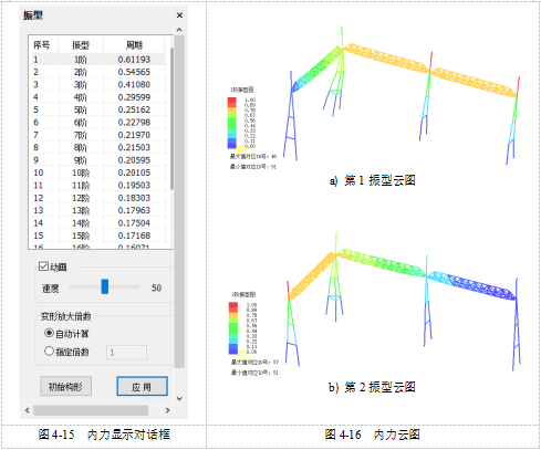 如图4-15所示,振型结果提供了求解振型数及相应的结构振动周期,振型按照周期数值由大到小排列。