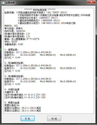 目录 搜索 展开 首页版权与商标说明免责声明第1章 软件功能简介1.1 软件概述1.2 技术依据第2章 参数化建模2.1 创建模型2.1.1 正交轴网2.1.2 构架柱1、人字柱建模2、格构柱建模3、圆管柱建模2.1.3 构架梁1、格构梁建模2、圆管梁建模2.1.4 独立避雷针1、钢管避雷针2、三角形格构避雷针3、四边形格构避雷针2.1.5 构架编辑2.1.6 避雷针编辑2.2 构件编辑2.2.1 截面定义2.2.2 构件删除和构件复制2.3 构件信息2.3.1 材料定义2.3.2 计算长度系数2.4 荷载布置2.4.1 风荷载2.4.2 点线荷载2.4.3 温度作用第3章 约束布置3.1 支座约束3.2 梁单元端部约束3.2.1 一端铰接/两端铰接/两端刚接/删除一端铰接3.2.2 梁端约束第4章 计算分析与结果查看4.1 模型检查4.2 设计参数4.2.1 设计信息4.2.2 地震计算信息4.2.3 工况组合4.3 线性计算4.3.1 线性计算4.3.2 模态分析4.4 计算结果查询4.4.1 位移显示4.4.2 内力显示4.4.3 支座反力显示4.4.4 振型结果显示4.4.5 内力表格4.4.6 构件验算查询4.4.7 生成计算书4.5 基础设计第5章 节点设计5.1 连接设计5.1.1 连接参数1、通用参数2、人字柱参数3、桁架梁参数4、全圆管格构梁参数5、钢管柱参数6、钢管梁参数7、格构柱参数(主杆角钢)8、地线柱与避雷针参数5.1.2 自动设计5.1.3 补充连接设计1、法兰节点2、角钢分段节点3、挂线点节点4、检修走道5、爬梯5.1.4 基础设计1.使用变电构架的基础设计2.使用跳转PM基础进行基础设计5.2 节点编辑第6章 施工图设计6.1 图纸配置6.2 施工图生成第7章 接力REVIT或ABD技术条件一 抗震设计基本规定1.1 重力荷载代表值1.2 抗震设计调整二 荷载2.1 荷载工况2.2 风荷载2.2.1 风荷载体型系数2.2.2 风压高度变化系数2.2.3 风振系数2.3 荷载效应组合2.3.1 运行工况1、大风工况2、覆冰有风工况3、温度有风工况2.3.2 安装工况2.3.3 检修工况2.3.4 地震作用工况2.3.5 正常使用工况三 连接计算3.1 螺栓连接3.2 焊缝连接3.3 法兰节点3.4 柱脚节点四 基础设计4.1 地基验算4.1.1 基底压力计算4.1.2 修正后的地基承载力特征值计算4.1.3 地基抗震承载力调整4.1.4 基础底面积确定4.2 基础抗拔和抗倾覆稳定验算4.2.1 基础抗拔稳定验算4.2.2 基础抗倾覆稳定验算4.3 基础计算4.3.1 基础高度取值4.3.2 基础冲切验算4.3.3 基础受剪承载力计算4.3.4 基础底板受弯配筋计算 暂无相关搜索结果! 4.4.6 构件验算查询 4.4.6 构件验算查询 用于查询单构件设计验算结果。 单击“构件验算查询”,光标会变为十字型。点击构件,将出现如图4-20所示对话框,全面显示构件验算结果及验算依据。点击对话框下的“文本”按钮,验算内容将重新以文本的形式展示。 图4-20 构件验算结果查询