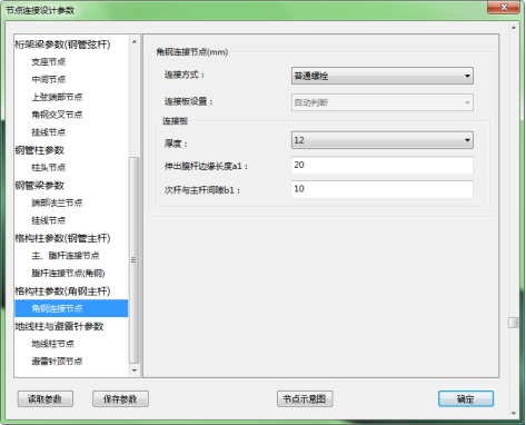 目录 搜索 展开 首页版权与商标说明免责声明第1章 软件功能简介1.1 软件概述1.2 技术依据第2章 参数化建模2.1 创建模型2.1.1 正交轴网2.1.2 构架柱1、人字柱建模2、格构柱建模3、圆管柱建模2.1.3 构架梁1、格构梁建模2、圆管梁建模2.1.4 独立避雷针1、钢管避雷针2、三角形格构避雷针3、四边形格构避雷针2.1.5 构架编辑2.1.6 避雷针编辑2.2 构件编辑2.2.1 截面定义2.2.2 构件删除和构件复制2.3 构件信息2.3.1 材料定义2.3.2 计算长度系数2.4 荷载布置2.4.1 风荷载2.4.2 点线荷载2.4.3 温度作用第3章 约束布置3.1 支座约束3.2 梁单元端部约束3.2.1 一端铰接/两端铰接/两端刚接/删除一端铰接3.2.2 梁端约束第4章 计算分析与结果查看4.1 模型检查4.2 设计参数4.2.1 设计信息4.2.2 地震计算信息4.2.3 工况组合4.3 线性计算4.3.1 线性计算4.3.2 模态分析4.4 计算结果查询4.4.1 位移显示4.4.2 内力显示4.4.3 支座反力显示4.4.4 振型结果显示4.4.5 内力表格4.4.6 构件验算查询4.4.7 生成计算书4.5 基础设计第5章 节点设计5.1 连接设计5.1.1 连接参数1、通用参数2、人字柱参数3、桁架梁参数4、全圆管格构梁参数5、钢管柱参数6、钢管梁参数7、格构柱参数(主杆角钢)8、地线柱与避雷针参数5.1.2 自动设计5.1.3 补充连接设计1、法兰节点2、角钢分段节点3、挂线点节点4、检修走道5、爬梯5.1.4 基础设计1.使用变电构架的基础设计2.使用跳转PM基础进行基础设计5.2 节点编辑第6章 施工图设计6.1 图纸配置6.2 施工图生成第7章 接力REVIT或ABD技术条件一 抗震设计基本规定1.1 重力荷载代表值1.2 抗震设计调整二 荷载2.1 荷载工况2.2 风荷载2.2.1 风荷载体型系数2.2.2 风压高度变化系数2.2.3 风振系数2.3 荷载效应组合2.3.1 运行工况1、大风工况2、覆冰有风工况3、温度有风工况2.3.2 安装工况2.3.3 检修工况2.3.4 地震作用工况2.3.5 正常使用工况三 连接计算3.1 螺栓连接3.2 焊缝连接3.3 法兰节点3.4 柱脚节点四 基础设计4.1 地基验算4.1.1 基底压力计算4.1.2 修正后的地基承载力特征值计算4.1.3 地基抗震承载力调整4.1.4 基础底面积确定4.2 基础抗拔和抗倾覆稳定验算4.2.1 基础抗拔稳定验算4.2.2 基础抗倾覆稳定验算4.3 基础计算4.3.1 基础高度取值4.3.2 基础冲切验算4.3.3 基础受剪承载力计算4.3.4 基础底板受弯配筋计算 暂无相关搜索结果! 7、格构柱参数(主杆角钢) 7、格构柱参数(主杆角钢) 图5-13 格构柱(主杆角钢)参数参数页面 格构柱(主杆角钢)的节点类型全部为角钢连接节点,与此对应,格构柱参数给出了对应的主要控制参数,具体参数的意义可参考对话框给出的节点示意图去理解。 图5-14 格构柱(主杆角钢)主要节点类型