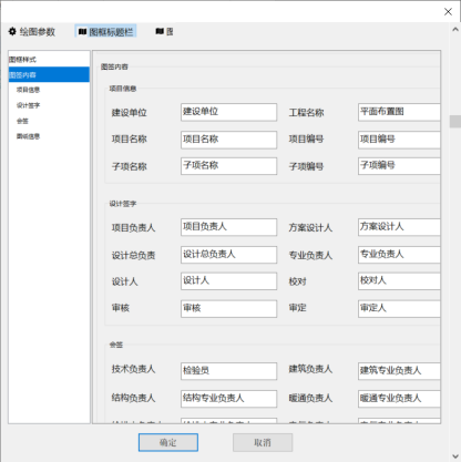 图框和标题栏设置如下图,可以设置施工图中会签栏的相关信息。