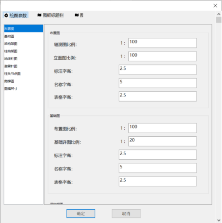 绘图参数中可以设置各类图纸的比例和字高,以及图幅的尺寸。