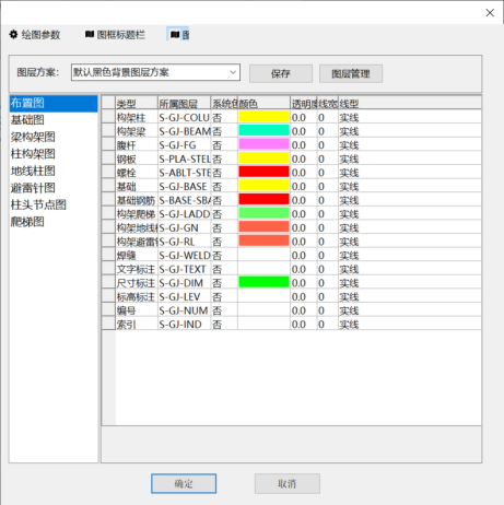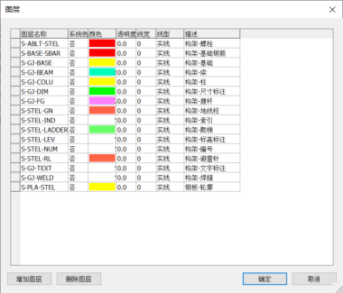 可以设置各个图纸的图层相关的颜色和线型等信息。如果需要对当前图纸的图层进行增删,则可以点击右上角的“图层管理”按钮,在弹出的对话框中进行操作即可,当然这个对话框中也可以修改包括图层名称等的各种信息。