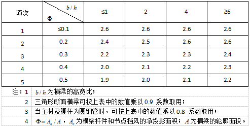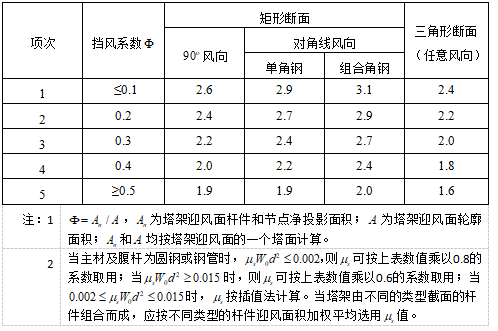 目录 搜索 展开 首页版权与商标说明免责声明第1章 软件功能简介1.1 软件概述1.2 技术依据第2章 参数化建模2.1 创建模型2.1.1 正交轴网2.1.2 构架柱1、人字柱建模2、格构柱建模3、圆管柱建模2.1.3 构架梁1、格构梁建模2、圆管梁建模2.1.4 独立避雷针1、钢管避雷针2、三角形格构避雷针3、四边形格构避雷针2.1.5 构架编辑2.1.6 避雷针编辑2.2 构件编辑2.2.1 截面定义2.2.2 构件删除和构件复制2.3 构件信息2.3.1 材料定义2.3.2 计算长度系数2.4 荷载布置2.4.1 风荷载2.4.2 点线荷载2.4.3 温度作用第3章 约束布置3.1 支座约束3.2 梁单元端部约束3.2.1 一端铰接/两端铰接/两端刚接/删除一端铰接3.2.2 梁端约束第4章 计算分析与结果查看4.1 模型检查4.2 设计参数4.2.1 设计信息4.2.2 地震计算信息4.2.3 工况组合4.3 线性计算4.3.1 线性计算4.3.2 模态分析4.4 计算结果查询4.4.1 位移显示4.4.2 内力显示4.4.3 支座反力显示4.4.4 振型结果显示4.4.5 内力表格4.4.6 构件验算查询4.4.7 生成计算书4.5 基础设计第5章 节点设计5.1 连接设计5.1.1 连接参数1、通用参数2、人字柱参数3、桁架梁参数4、全圆管格构梁参数5、钢管柱参数6、钢管梁参数7、格构柱参数(主杆角钢)8、地线柱与避雷针参数5.1.2 自动设计5.1.3 补充连接设计1、法兰节点2、角钢分段节点3、挂线点节点4、检修走道5、爬梯5.1.4 基础设计1.使用变电构架的基础设计2.使用跳转PM基础进行基础设计5.2 节点编辑第6章 施工图设计6.1 图纸配置6.2 施工图生成第7章 接力REVIT或ABD技术条件一 抗震设计基本规定1.1 重力荷载代表值1.2 抗震设计调整二 荷载2.1 荷载工况2.2 风荷载2.2.1 风荷载体型系数2.2.2 风压高度变化系数2.2.3 风振系数2.3 荷载效应组合2.3.1 运行工况1、大风工况2、覆冰有风工况3、温度有风工况2.3.2 安装工况2.3.3 检修工况2.3.4 地震作用工况2.3.5 正常使用工况三 连接计算3.1 螺栓连接3.2 焊缝连接3.3 法兰节点3.4 柱脚节点四 基础设计4.1 地基验算4.1.1 基底压力计算4.1.2 修正后的地基承载力特征值计算4.1.3 地基抗震承载力调整4.1.4 基础底面积确定4.2 基础抗拔和抗倾覆稳定验算4.2.1 基础抗拔稳定验算4.2.2 基础抗倾覆稳定验算4.3 基础计算4.3.1 基础高度取值4.3.2 基础冲切验算4.3.3 基础受剪承载力计算4.3.4 基础底板受弯配筋计算 暂无相关搜索结果! 2.2.1 风荷载体型系数 2.2.1 风荷载体型系数 风荷载体型系数根据实际情况由程序自动计算计算,计算方法如下所示。 1)独立单杆风荷载体型系数可按表6-2取用: 表6-2 独立杆整体计算时风荷载体型系数 注: 2)各类型钢及组合型钢风荷载体型系数取1.3; 3)直立塔架整体风荷载体型系数可按下表6-3取用: 表6-3 单角钢组成的塔架结构的整体时风荷载体型系数 4)矩形及三角形断面格构式横梁的整体风荷载体型系数可按下表6-4取用: 表6-4 矩形横梁整体风荷载体型系数