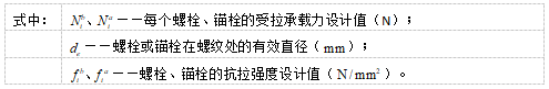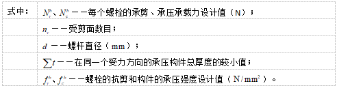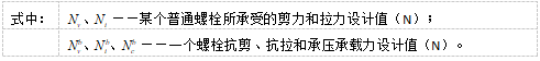 目录 搜索 展开 首页版权与商标说明免责声明第1章 软件功能简介1.1 软件概述1.2 技术依据第2章 参数化建模2.1 创建模型2.1.1 正交轴网2.1.2 构架柱1、人字柱建模2、格构柱建模3、圆管柱建模2.1.3 构架梁1、格构梁建模2、圆管梁建模2.1.4 独立避雷针1、钢管避雷针2、三角形格构避雷针3、四边形格构避雷针2.1.5 构架编辑2.1.6 避雷针编辑2.2 构件编辑2.2.1 截面定义2.2.2 构件删除和构件复制2.3 构件信息2.3.1 材料定义2.3.2 计算长度系数2.4 荷载布置2.4.1 风荷载2.4.2 点线荷载2.4.3 温度作用第3章 约束布置3.1 支座约束3.2 梁单元端部约束3.2.1 一端铰接/两端铰接/两端刚接/删除一端铰接3.2.2 梁端约束第4章 计算分析与结果查看4.1 模型检查4.2 设计参数4.2.1 设计信息4.2.2 地震计算信息4.2.3 工况组合4.3 线性计算4.3.1 线性计算4.3.2 模态分析4.4 计算结果查询4.4.1 位移显示4.4.2 内力显示4.4.3 支座反力显示4.4.4 振型结果显示4.4.5 内力表格4.4.6 构件验算查询4.4.7 生成计算书4.5 基础设计第5章 节点设计5.1 连接设计5.1.1 连接参数1、通用参数2、人字柱参数3、桁架梁参数4、全圆管格构梁参数5、钢管柱参数6、钢管梁参数7、格构柱参数(主杆角钢)8、地线柱与避雷针参数5.1.2 自动设计5.1.3 补充连接设计1、法兰节点2、角钢分段节点3、挂线点节点4、检修走道5、爬梯5.1.4 基础设计1.使用变电构架的基础设计2.使用跳转PM基础进行基础设计5.2 节点编辑第6章 施工图设计6.1 图纸配置6.2 施工图生成第7章 接力REVIT或ABD技术条件一 抗震设计基本规定1.1 重力荷载代表值1.2 抗震设计调整二 荷载2.1 荷载工况2.2 风荷载2.2.1 风荷载体型系数2.2.2 风压高度变化系数2.2.3 风振系数2.3 荷载效应组合2.3.1 运行工况1、大风工况2、覆冰有风工况3、温度有风工况2.3.2 安装工况2.3.3 检修工况2.3.4 地震作用工况2.3.5 正常使用工况三 连接计算3.1 螺栓连接3.2 焊缝连接3.3 法兰节点3.4 柱脚节点四 基础设计4.1 地基验算4.1.1 基底压力计算4.1.2 修正后的地基承载力特征值计算4.1.3 地基抗震承载力调整4.1.4 基础底面积确定4.2 基础抗拔和抗倾覆稳定验算4.2.1 基础抗拔稳定验算4.2.2 基础抗倾覆稳定验算4.3 基础计算4.3.1 基础高度取值4.3.2 基础冲切验算4.3.3 基础受剪承载力计算4.3.4 基础底板受弯配筋计算 暂无相关搜索结果! 3.1 螺栓连接 3.1 螺栓连接 3.1.1 在螺栓受剪连接中,每个螺栓的承载力设计值应取受剪和承压承载力设计值中的较小者。 受剪承载力: 受压承载力: 3.1.2 在螺栓或锚栓杆轴向方向受拉的连接中,每个螺栓或锚栓的承载力设计值应按下列公式计算: 螺栓: 锚栓: 3.1.3 同时承受剪力和轴心拉力的螺栓,应符合下列公式的要求:
