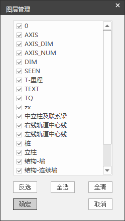 【图层开关】: 点击【图层开关】弹出如图 2.2-4所示的对话框。用户可以对导入的DWG图纸内所有的图层进行管理(被选中的图层会显示在主界面,未被选中的图层会关闭),方便后续的构件识别工作。