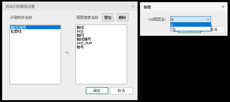 【自动识别】:点击【自动识别】图标,弹出如图 2.2-5所示的对话框。左侧对话框中的内容为被识别的构件类型。右侧对话框中则显示程序默认的某构件类型在图纸中对应的图层搜索名称。