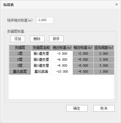 标高表功能可定义场坪绝对标高、各道支锚层标高和基底标高。