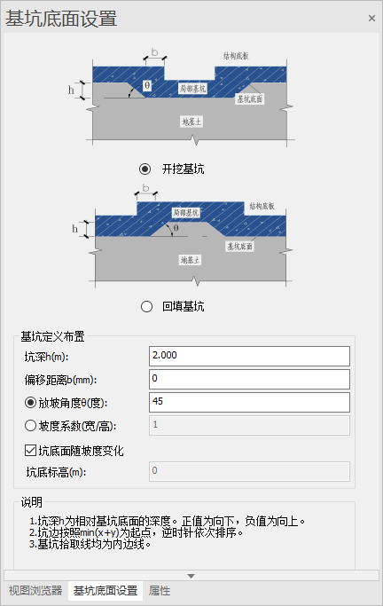 注:布置对话框中的坑深是相对于标高表中基坑底面标高的。