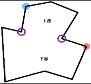 排桩布置提供了两种布置方式:多桩布置、单桩布置。多桩布置可以方便的在单段、多段和封闭轮廓线上批量进行排桩布置。在封闭轮廓线进行整体布置时,若不考虑阴阳角,以min(x+y)为起点,沿逆时针方向按统一桩间距s布置排桩;若考虑阴阳角,如图 2.7-4所示,有阳角的封闭线,每个阳角均为起点,阳角两个方向均可布桩;两个阳角组成一个布桩区域,两个阳角依次按【水平间距s】布桩,布桩终点为逆时针方向第二个阳角前的转折点处(蓝圈点处),终点处进行【终点两桩最小距离d】判断。仅封闭轮廓线时考虑【终点两桩最小距离d】,单段线、多段线均按照【水平间距s】布桩。