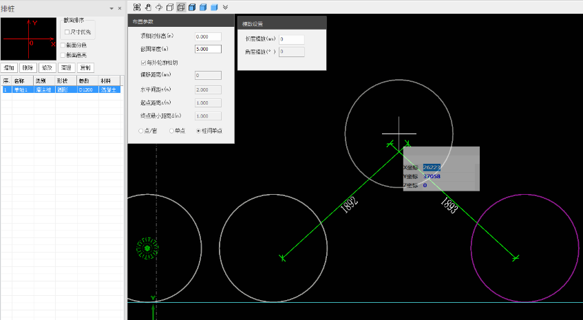 用鼠标在截面定义列表中点取一种桩类型后,移动鼠标到平面上需要的位置,选择多桩或单桩方式完成排桩布置。如果存在偏移距离,相对标高、嵌固深度、桩间距等差别,可同时在布置参数框中填写相应的参数值。