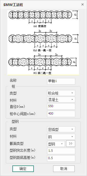 SMW工法桩支持密插型、插二跳一型和插一跳一型三种类型,SMW工法桩布置依赖轮廓线,支持多桩和单桩布置型式。