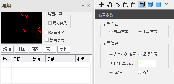 布置时,可选择以梁中心线或梁顶面标高布置,相对标高是相对于支锚层的标高,输入正值表示高于支锚层标高,负值表示低于支锚层标高。