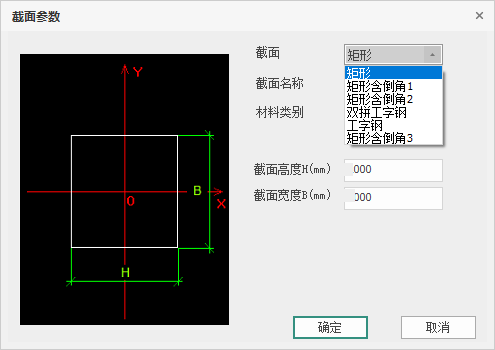 单击【增加】按钮,弹出如图 2.7-26所示的【截面参数】对话框,用户可对截面类型(矩形、矩形含倒角1、矩形含倒角2、矩形含倒角3、双拼工字钢、工字钢)、截面名称、材料类别(混凝土、钢)、截面尺寸进行定义。完成后单击【确定】按钮,参数自动添加到截面列表中;点击【取消】,退出本次交互。矩形含倒角1、矩形含倒角2截面为锚索/杆腰梁,支持锚索布置。