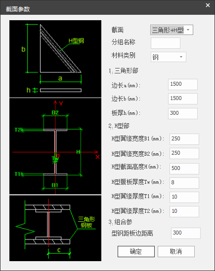 单击【增加】按钮,弹出【截面参数】对话框,用户可对板撑截面类型(三角形如图 2.7-28、三角形+H型钢组合如图 2.7-29)、分组名称、材料类别(混凝土、钢)、以及截面尺寸进行定义。完成后单击【确定】按钮,板撑参数自动添加到截面列表中;点击【取消】,退出本次交互。