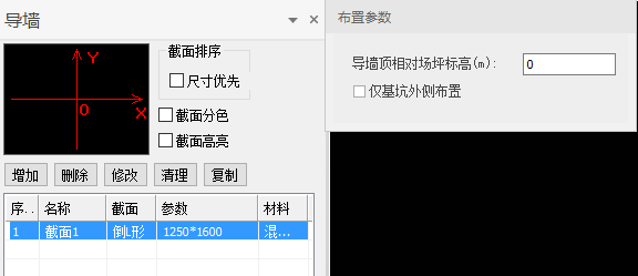 导墙布置:导墙截面参数设置完成后,在支锚一层选择地连墙进行导墙布置。通过【布置参数】输入导墙相对场坪标高的数值(默认为零),确定导墙竖向位置。当勾选仅在基坑外侧布置时,则仅在基坑外侧布置单边导墙,默认不勾选。