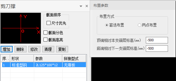 支持点/窗选择相同截面的相邻立柱布置剪刀撑,剪刀撑顶部标高为相对于当前支锚层的标高,底部标高为相对于下一支锚层的标高。