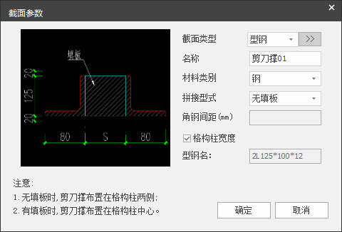 单击【增加】按钮,弹出截面参数对话框,如图 2.7- 54所示,可定义截面类型、拼接型式、型钢型式、材料(钢材料)。