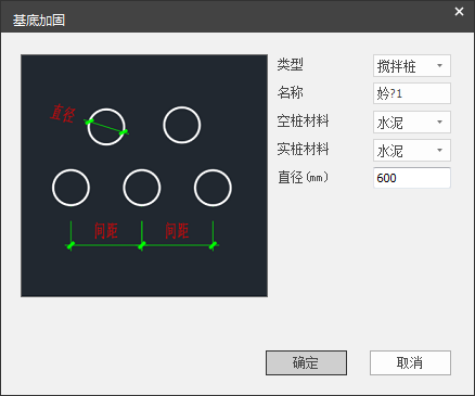 点击【增加】,弹出图 2.8-3基底加固类型对话框,可交互类型(搅拌桩、旋喷桩)、名称、空桩材料(水泥)、实桩材料(水泥)、直径。