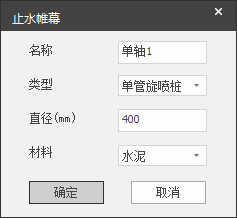 单击【增加】按钮,弹出如图 2.8-10所示的止水帷幕参数定义对话框。用户可以对止水帷幕的名称、类型(单管旋喷桩、双管旋喷桩、三管旋喷桩)、直径、材料(水泥)进行定义,完成后点击【确定】,自定义的止水帷幕被添加到图 2.8-9所示的列表中,点击【取消】,退出本次编辑。
