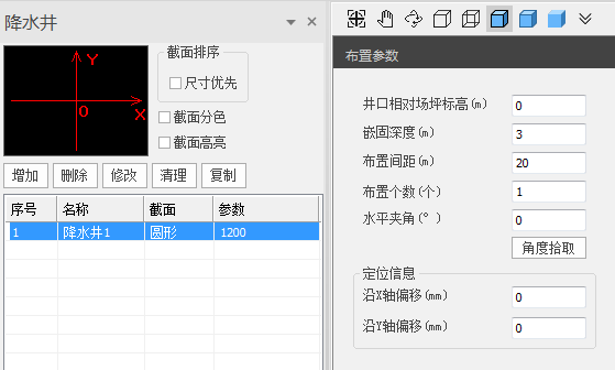 具体【布置参数】包括井口相对场坪标高,嵌固深度,布置间距,布置个数,水平夹角(同时布置多个降水井时,该排降水井与X轴的夹角,逆时针方向为正),定位信息(降水井相对于选中的点在X、Y轴方向上的偏心距离)。