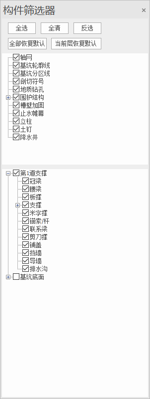 该功能在分层和整体模型下能够提供各类构件显隐以及选择的功能,可以快速显示、隐藏或选择某些构件,方便进行建模或模型修改。同时支持全选、全清、反选、全部恢复默认、当前层恢复默认等功能。