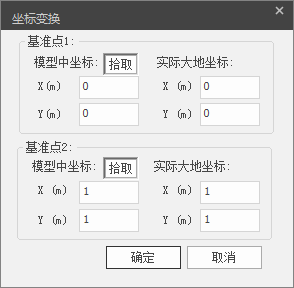 点击菜单栏中的【坐标转换】图标,弹出如图 3.1-1所示的对话框,用户需要在模型中选择两点,输入或拾取其在模型中的X、Y坐标,并输入这两点的实际大地坐标,点击确定后即可完成坐标转换。