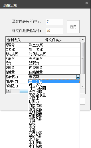 用户可以修改源文件表头所在行和数据起始行。修改并点击应用后,程序会把源文件中选定的表头所在行的每一列名称录入到【源文件表头】下的每一个下拉菜单中,并重新进行自动匹配,如匹配不成功,显示”未匹配”,并红色高亮显示,用户可自行手动选择匹配,如图 3.2-3所示。在匹配完成后点击确定,对话框关闭,数据导入;点击取消,数据不录入,对话框关闭。