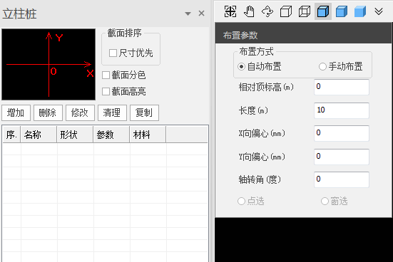 布置方式分为自动布置和手动布置两种。自动布置时立柱下自动生成桩。手动布置可点窗布置,点选布置时可在任意位置布置桩;窗选布置时,自动识别窗选范围内的立柱,并在柱下布桩。