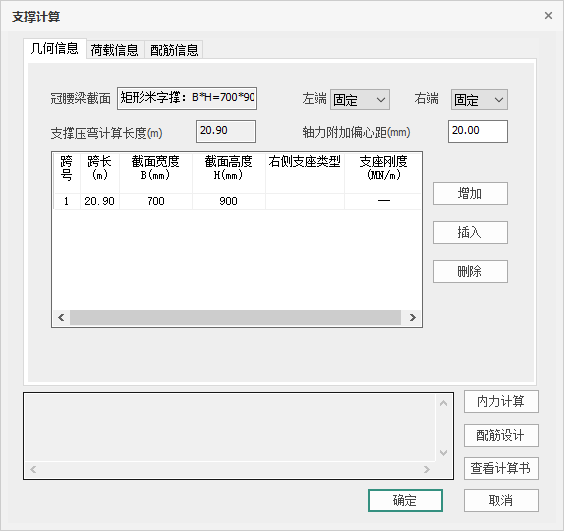 几何信息记录支撑的截面尺寸、跨长以及边界条件等参数,同时支持用户增加、插入或删除跨数,其中的参数含义为: