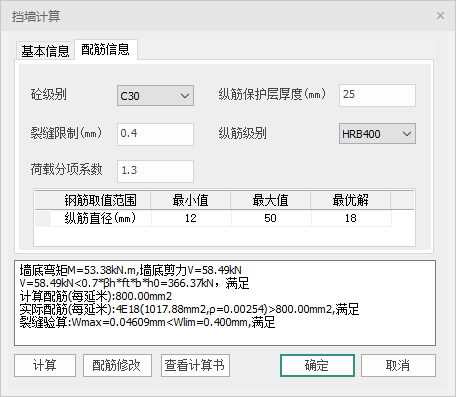 【计算】:点击计算,程序会根据上述的设置情况自动进行挡墙计算,并把核心计算结果显示在对话框下侧的结果显示窗口中,显示内容主要包括:墙底弯矩、剪力,计算配筋,实际配筋,以及裂缝验算结果。