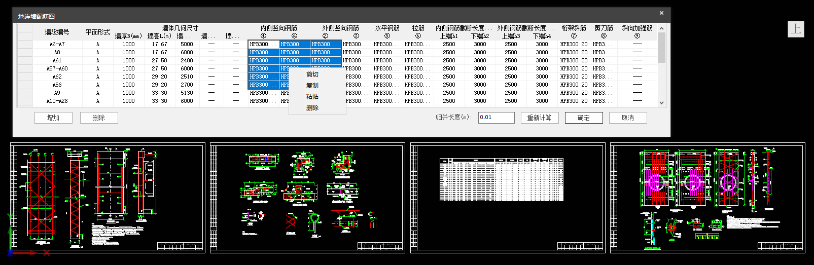 配筋表格支持删除行、增加行、编辑文本等功能,支持单元格框选右键编辑,包括剪切、复制、粘贴和删除。