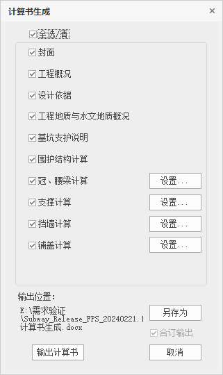 单击【冠腰梁计算】—【设置】,弹出如图 -2所示的对话框,界面默认显示已计算冠腰梁计算结果,可勾选目标计算书进行合并输出。
