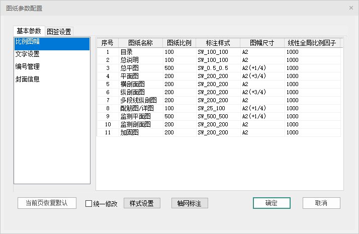 点击【图纸参数】弹出如图 5.1-1【基本参数】-【比例图幅】对话框,该对话框中用户可以对各类图纸的出图比例和图幅进行设置,【出图比例】为输入项,【标注样式】和【图幅尺寸】为下拉选项,包括图纸类别从A0~A4,图幅范围从An~An++,【线性全局比例因子】影响导出的DWG图纸中线性比例的表现效果(SLE命令)。