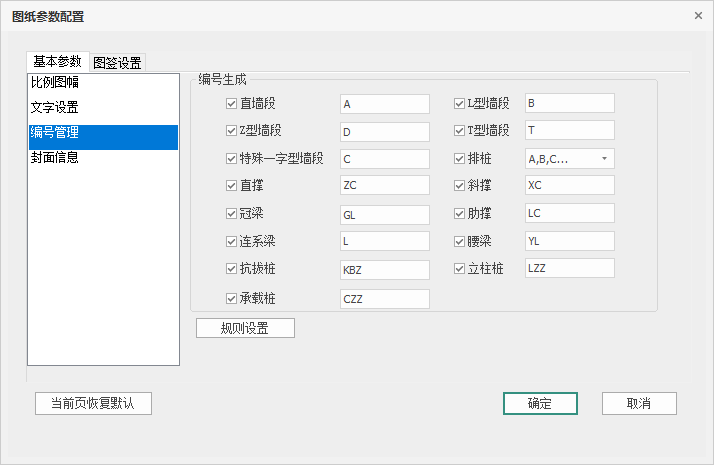 点击【基本参数】-【编号管理】弹出如图 5.1-6对话框,该对话框中用户可以对编号样式和规则进行设置,编号样式主要定义了各类构件的图纸编号表达,编号规则确定了部分构件的标注规则以及编号顺序: