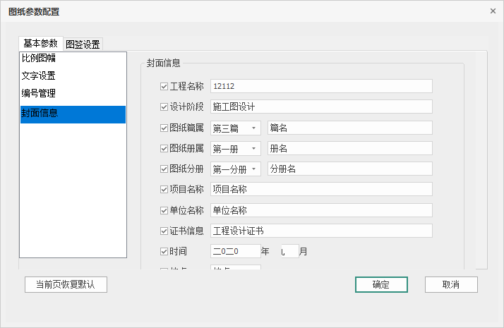 点击【基本参数】-【封面信息】弹出如图 5.1-7对话框,该对话框中用户可以对封面信息的内容进行设置: