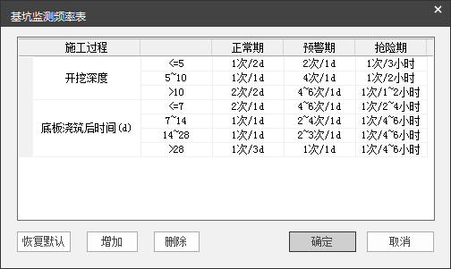 【监测频率表】:单击,弹出图 5.2-7界面,白显处可编辑,图中参数均为默认值,表格行支持增删等编辑。。